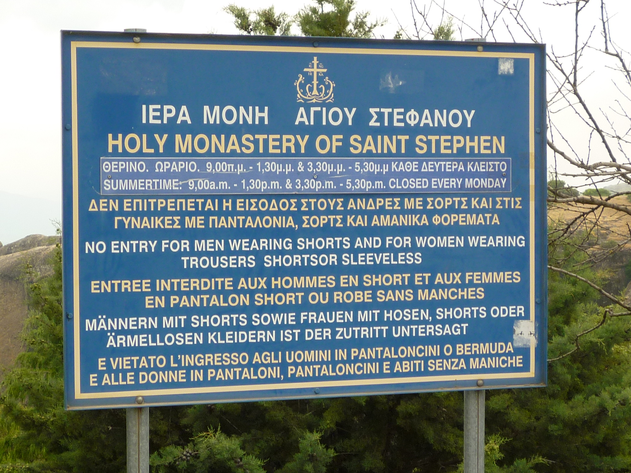 Holy Monastery of St. Stephen_Meteora (4) ← Previous Next → Sign warning of dress standards at St. Stephen’s monastery.