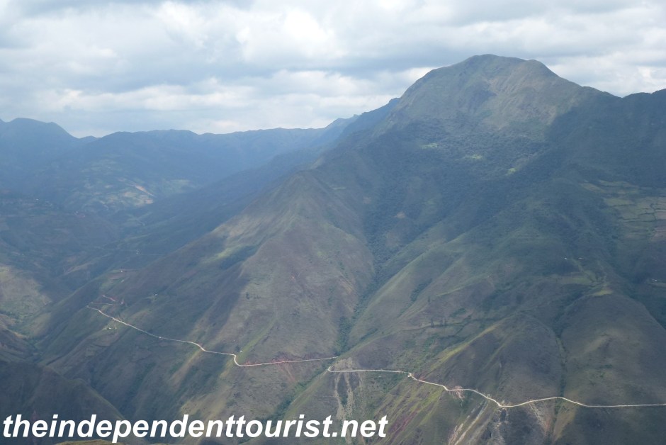 Kuelap_Peru (17) ← Previous Next → The scenery from the mountaintop fortress of Kuelap. The dirt road seen near the bottom of the picture is the road to the site