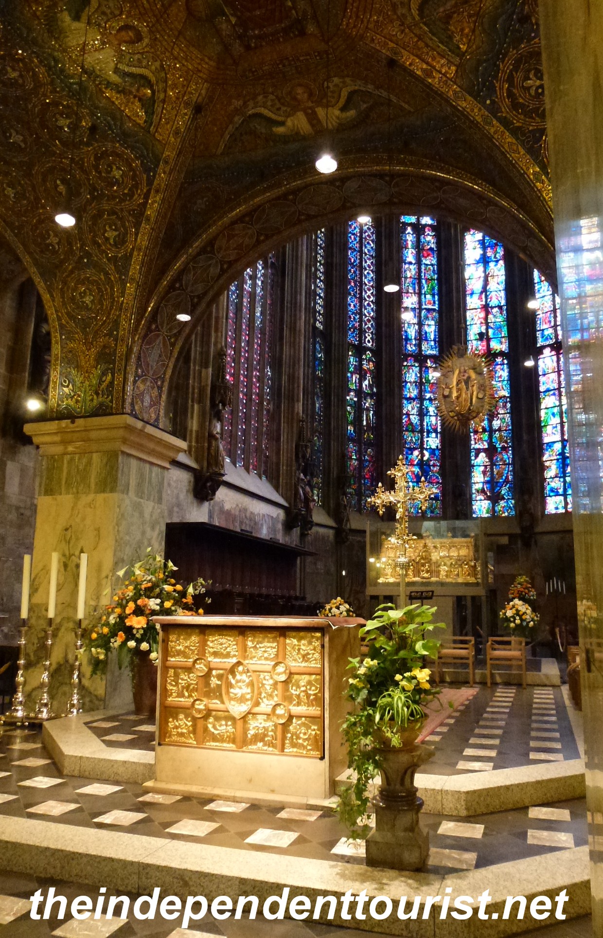 Aachen Germany Cathedral (6) ← Previous Next → The Choir of Aachen Cathedral, Charlemagne’s tomb is in the distance below the stained glass windows.