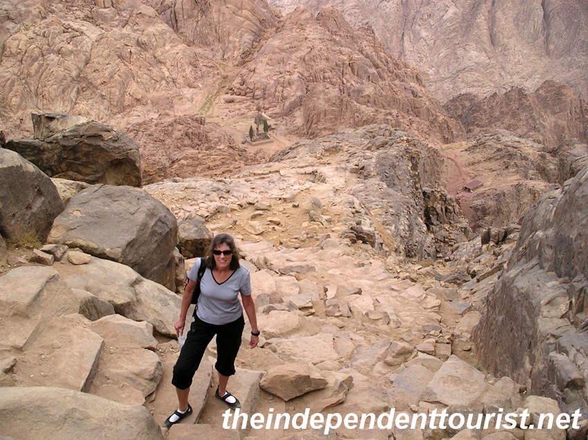 There are two ways to climb the Mount (altitude: 2,285 meters or 7,500 ft). There is the “camel path” which is wider and more “gently” sloping, or taking what is called the “Steps of Repentance” route– a very steep climb of 3,750 steps (hard on the knees) which was built by a monk doing penance—what a price to pay! We took the camel path, and it joins the “Steps of Repentance” path 750 steps below the summit.