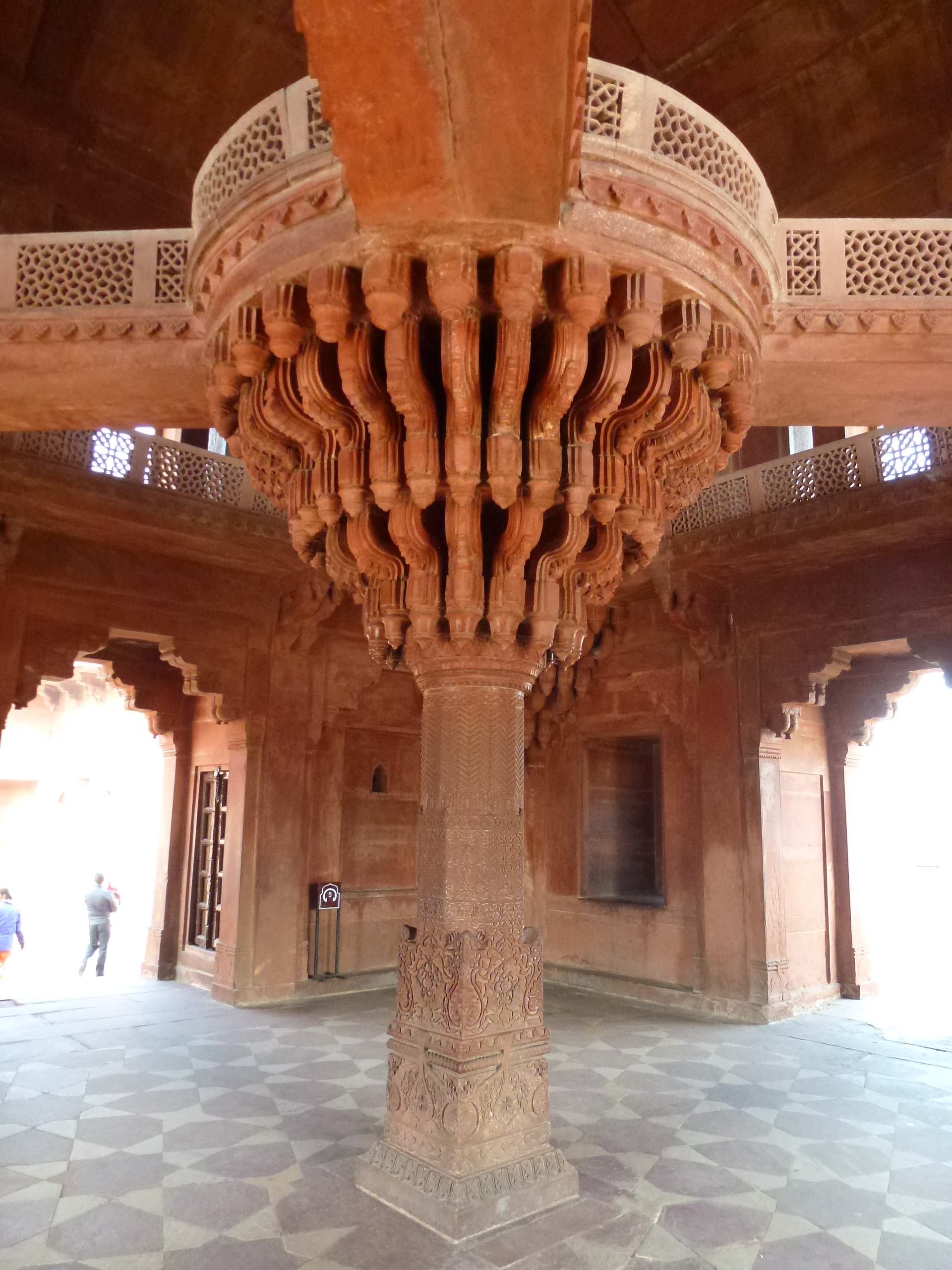 The Diwan-i-Khas (Hall of Private Audiences) with its magnificently carved central column. Akbar supposedly stood on top of this column and debated his scholars and ministers who stood at the ends of the four bridges extending out from the center.