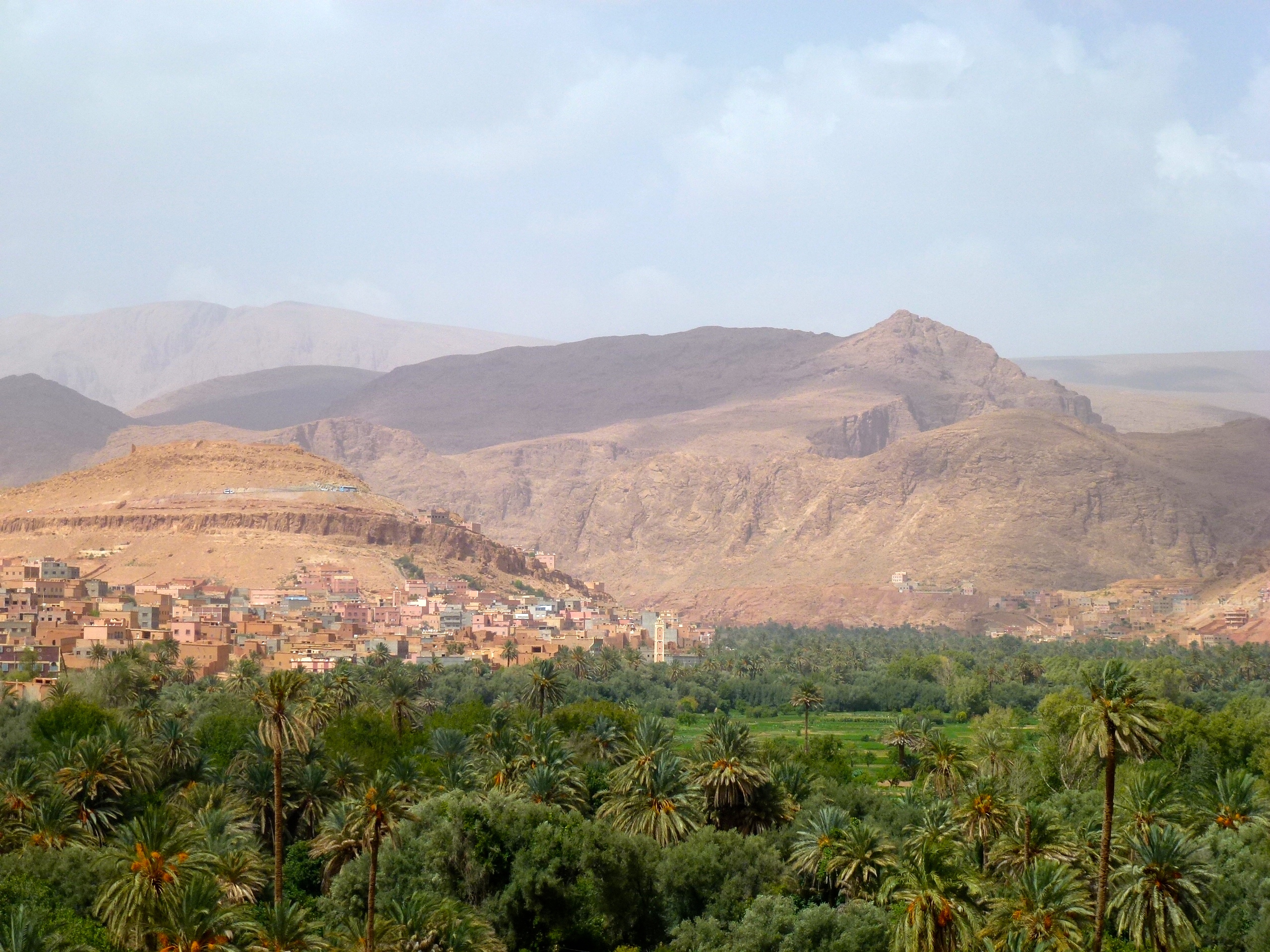 The stark contrast of the green palms with the dry mountains near Todra Gorge.