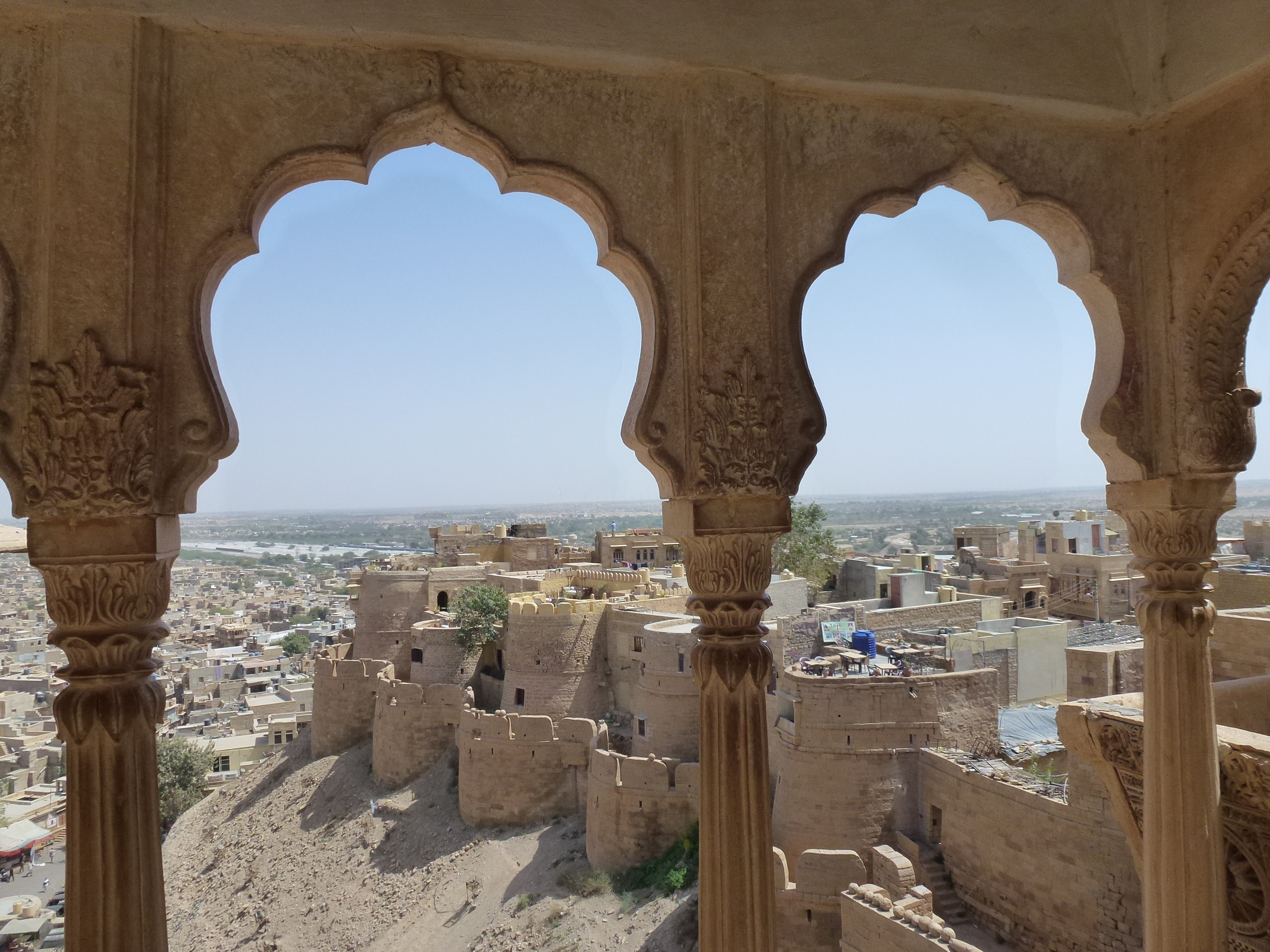 From Jodhpur we drove to Jaisalmer, a city in the Thar Desert near the Pakistani border, about 177 miles (285 km) from Jodhpur. The old part of Jaisalmer is contained within the extensive walls of the fort that sits on a hill, rising above the desert. It has a different feel than other parts of India, due to the desert location. The ancient fort city was founded back in 1156 and is still inhabited by 3,000 people. Jaisalmer had a strategic position in the 16th century, it was on the camel train routes between India and Central Asia. The fort city has narrow alleyways, with apartments, temples and shops practically stacked on top of each other.
