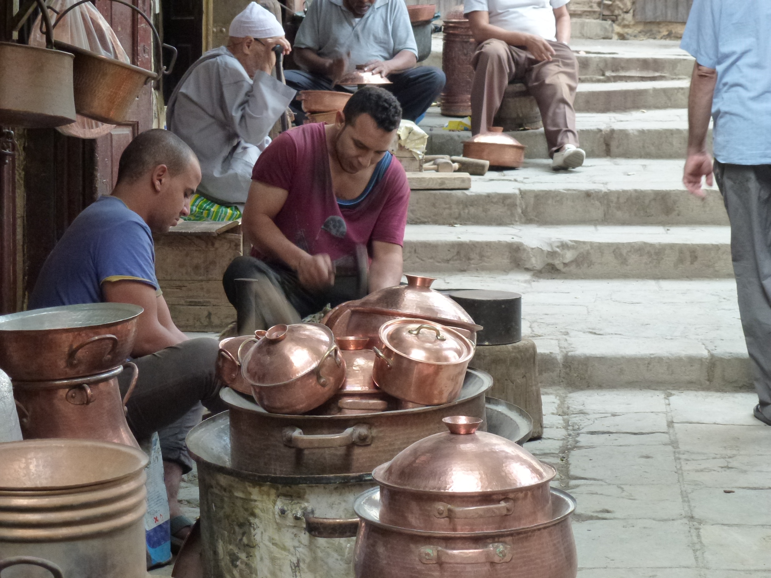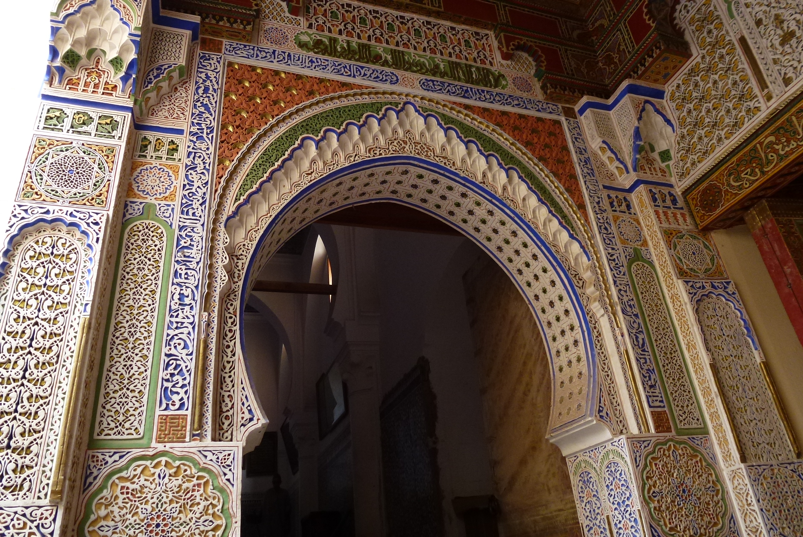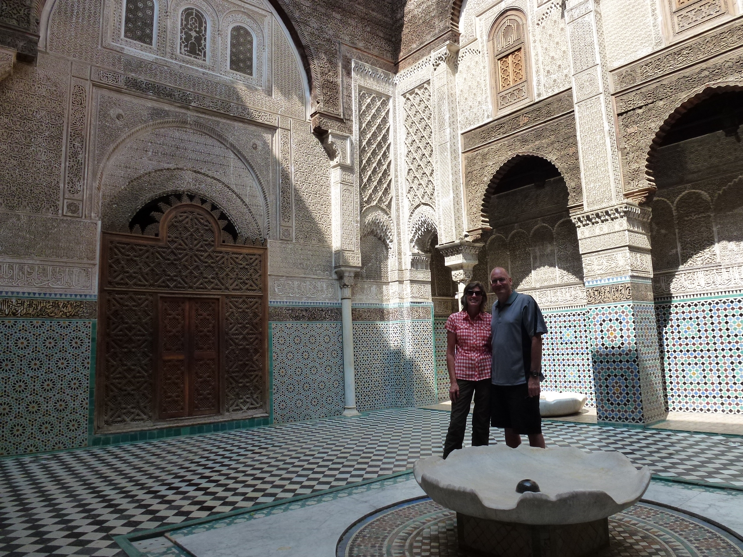 Medersas. Medersa means “place of study”. These were student colleges and used largely as residence halls, since most teaching would be done in the mosques. Fez was a great center of learning and the architecture of these halls is stunning. We visited two. The layout is similar – a main courtyard, student cells, prayer hall and oratory. Medersa Bou Inania. This is one of the highlights of a visit to Fez. The dark cedar wood, tile work and stucco is beautiful. This building is the city’s only building still in religious use that non-muslims are permitted to enter. It was built in the 14th century.