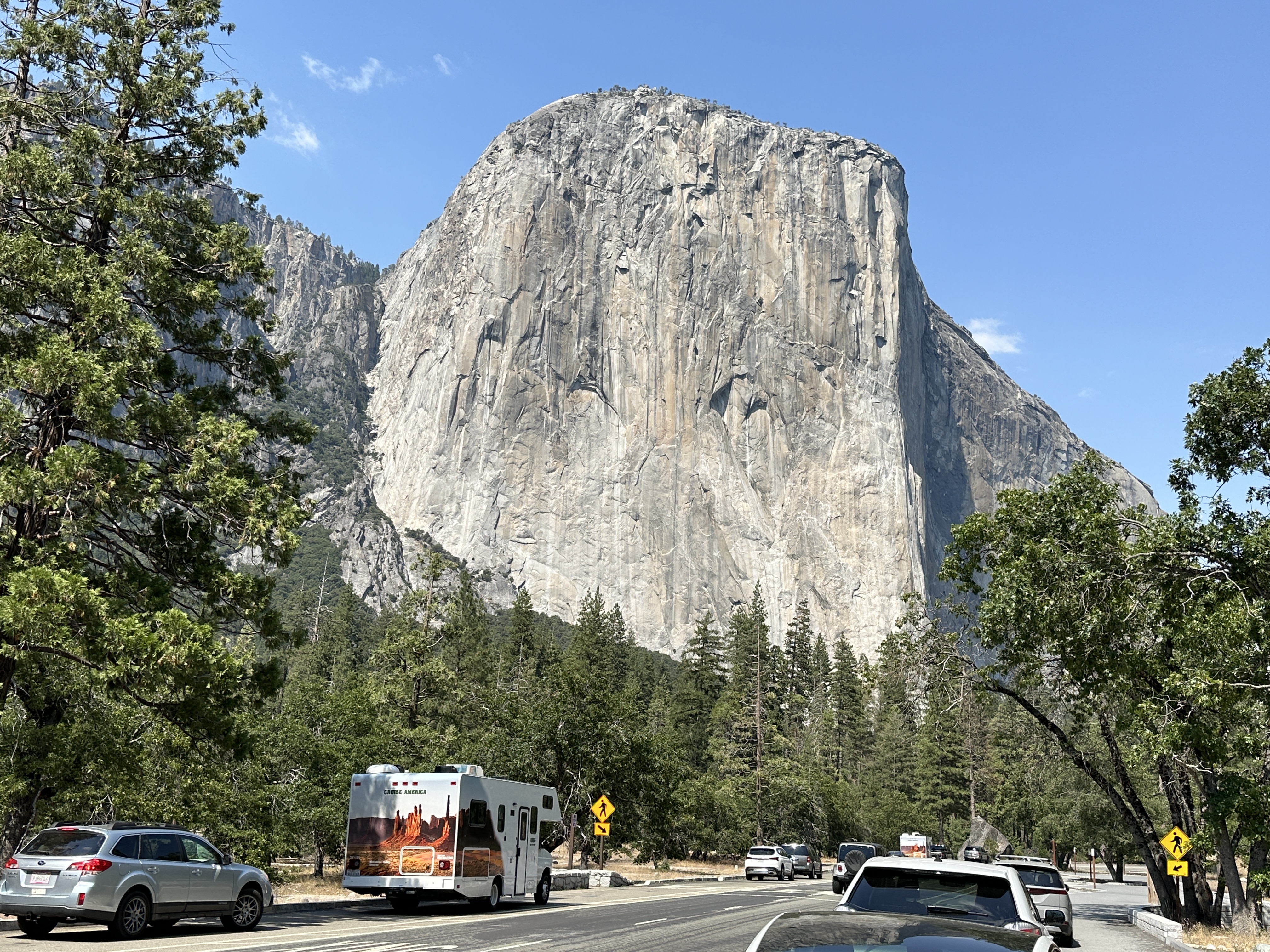 Camping in Yosemite Valley has its pluses and minuses. The main plus is that you are very close to the well-known Yosemite attractions, the main minus is the lack of solitude. Even if you book (on recreation.gov) at the right time and date (at 7 am Pacific exactly 4 months from the date of your planned visit) there is no guarantee you will get a camping spot, they fill up within seconds of being released. We were lucky and were able to get a spot in Upper Pines Campground, right next to the Merced River, almost directly below Half Dome and within minutes of many Valley attractions. I wish I had taken photos of the campground. Don’t expect privacy – the campgrounds are always full, the spots are close together with a few pine trees scattered about. Bear lockers are provided and essential. While the campgrounds have the standard restrooms and water spigots, I don’t believe any of the campgrounds have RV hookups (e.g., water, electricity, sewer), but they do have dump stations where you can take care of your RV’s needs. There are several small stores in the Valley where you can get supplies and snacks, and several restaurants as well.