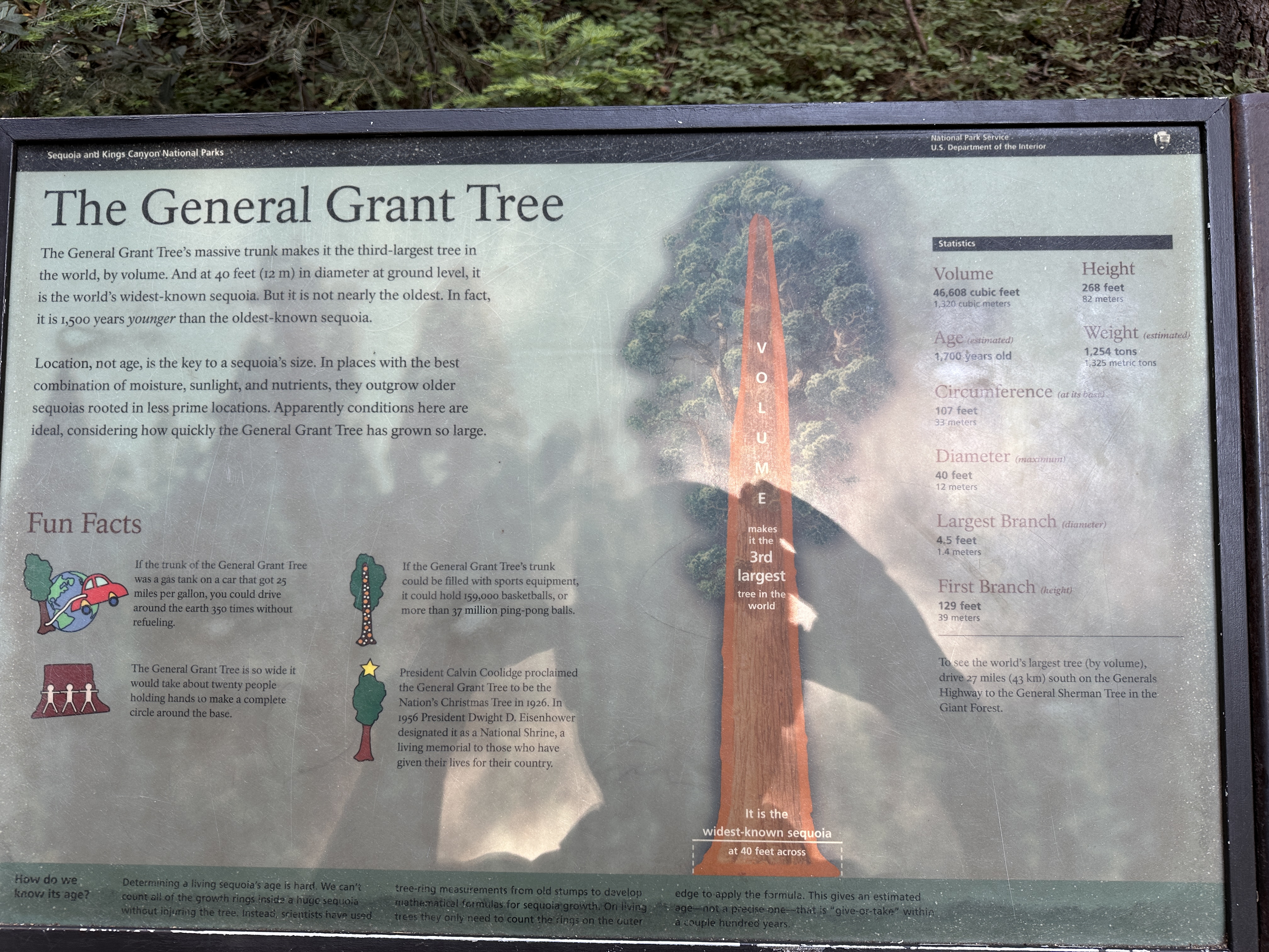 The General Grant tree was not far from the entrance to Kings Canyon and we made this our first stop. General Grant is 40 feet wide at its base, the widest-known sequoia tree and “just” 1,700 years old (some sequoias are 1,000 years older!). It was proclaimed to be the Nation’s Christmas tree in 1926. Good thing they didn’t cut it down! Other fun facts are shown in an image below.