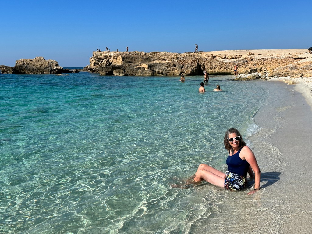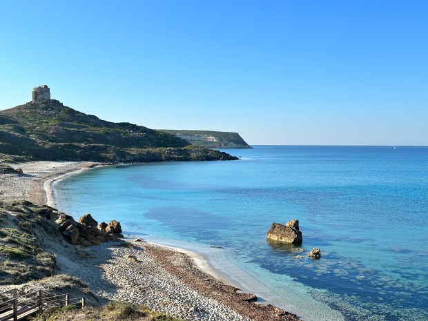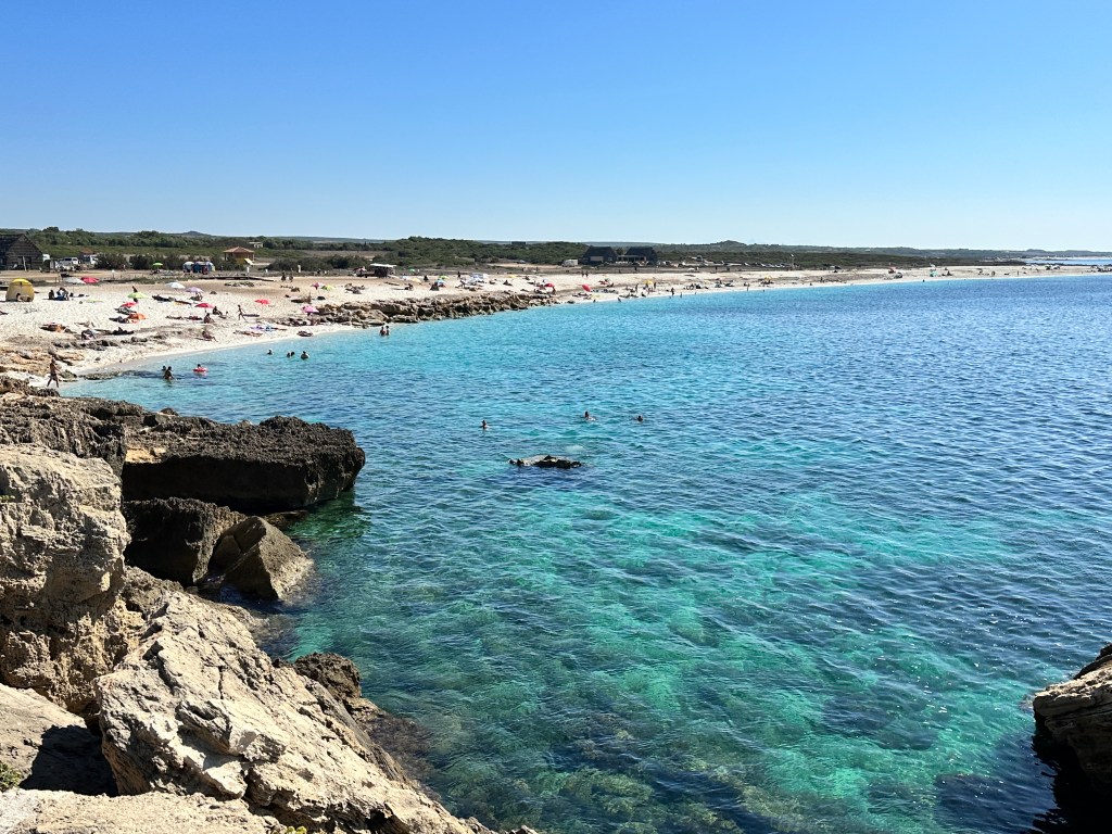 This beach on the Sinis peninsula is about 22 km (13 miles) from Oristano and one of the region’s most famous. There is a large parking lot and a refreshment stand near the beach. The quartz sand on this beach is amazing, I wish I had taken a close-up of it – it looks like translucent rice. Just another perfect beach in Sardinia! As with all beaches in Sardinia, it is a crime to remove the sand – be sure to leave the sand where it belongs on the beach for others to enjoy!