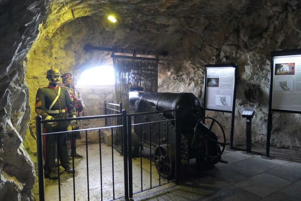 There are about 34 miles of tunnels in the Rock. They were built over a 200 year period from the 18th to the 20th centuries, for protection against bombardment and to facilitate the movement of supplies and quick access to defensive positions (gun emplacements) in strategic spots along the length of the Rock. The battles and political struggles (mainly between Spain, France and Britain) over this Rock could fill volumes. As part of our tour, we visited “The Great Siege” Tunnels at the northern end of Gibraltar, which were constructed during the siege of Gibraltar by Spain and France around the time of the American Revolutionary War. What a lot of work it must have taken to blast and dig these tunnels! The tunnels in some cases are multiple levels deep, and you can explore them for hours. There are many exhibits along points in the tunnels explaining the history and showing the living quarters, storage areas and cannon emplacements.