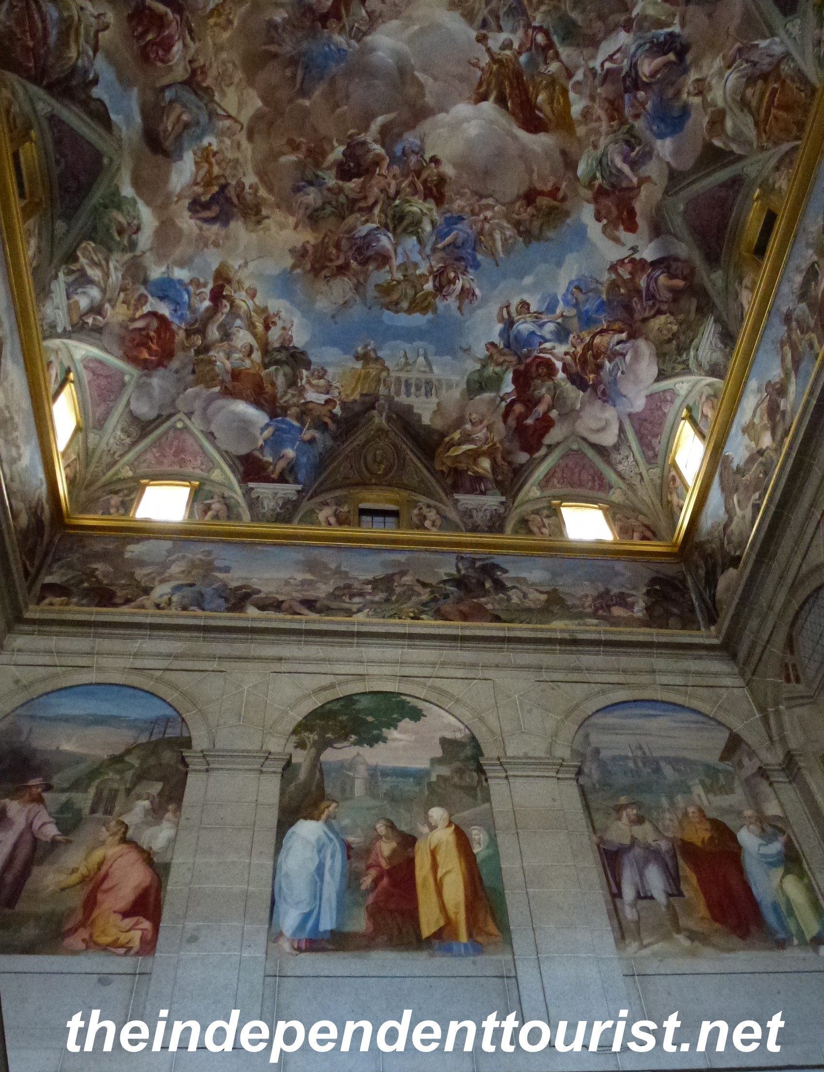 Although I’m sure I saw just a small portion of the entire complex, I was able to see exhibits of the construction techniques, rooms where the royal family lived, the pantheon where the kings and queens are buried, a long hall with rooms of tombs of royal children who did not live into adulthood, and another long hall with amazing wall paintings of successful battles by the Spanish Kings, an incredible library—due to both the ceiling artwork and the priceless volumes it contains, and the basilica which is so huge it reminded me of St. Peter’s basilica in Rome, and various other rooms.