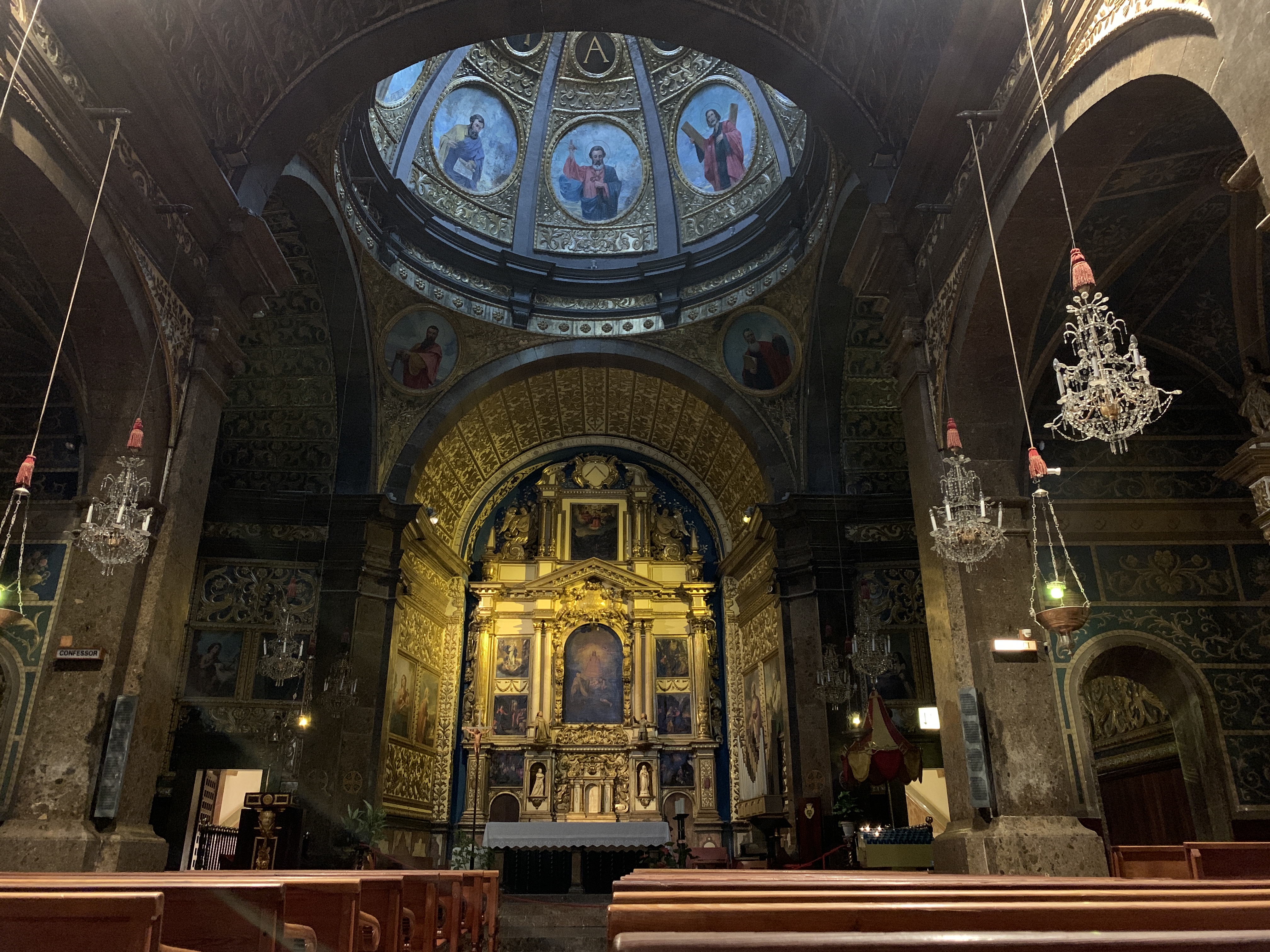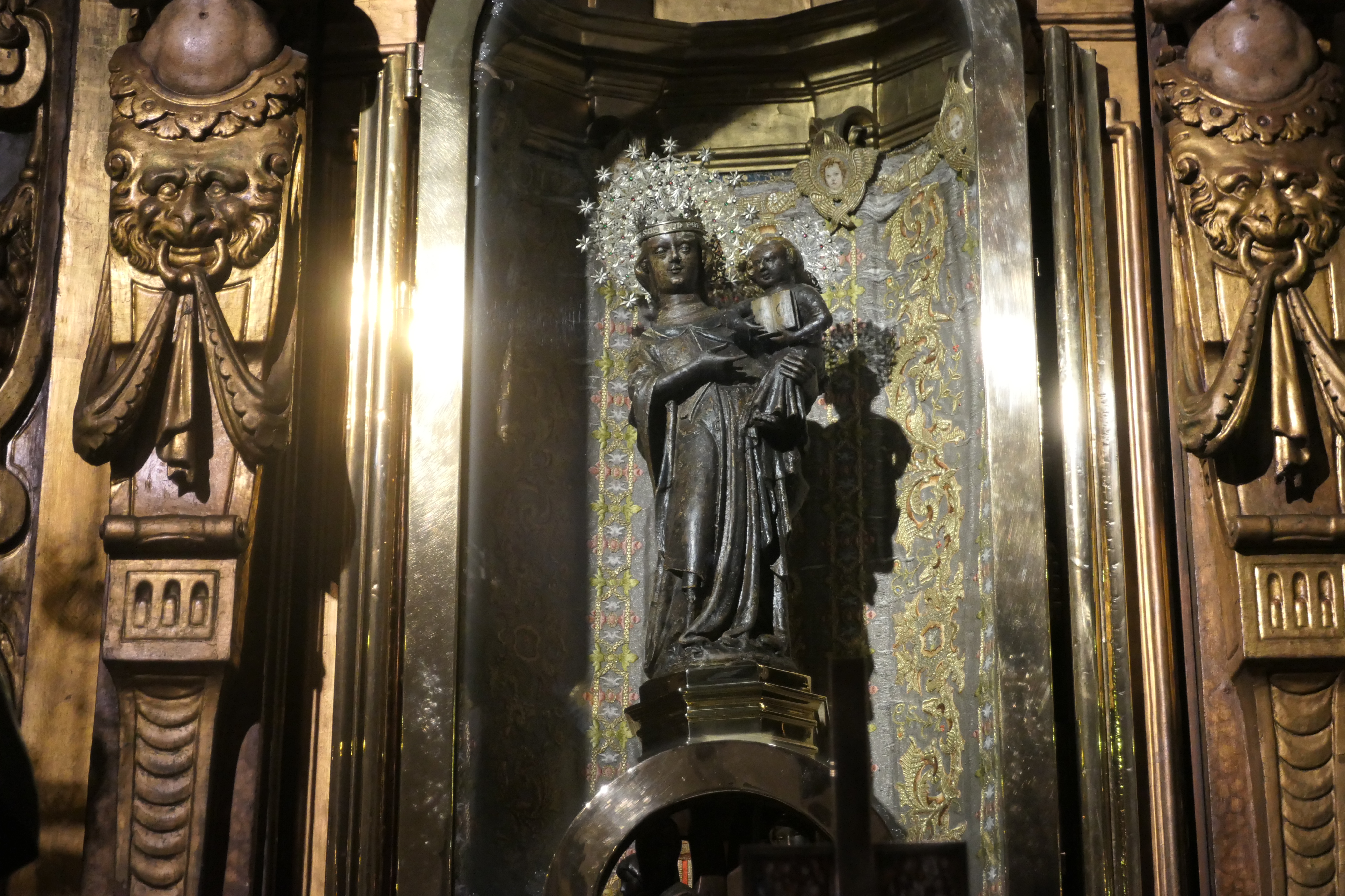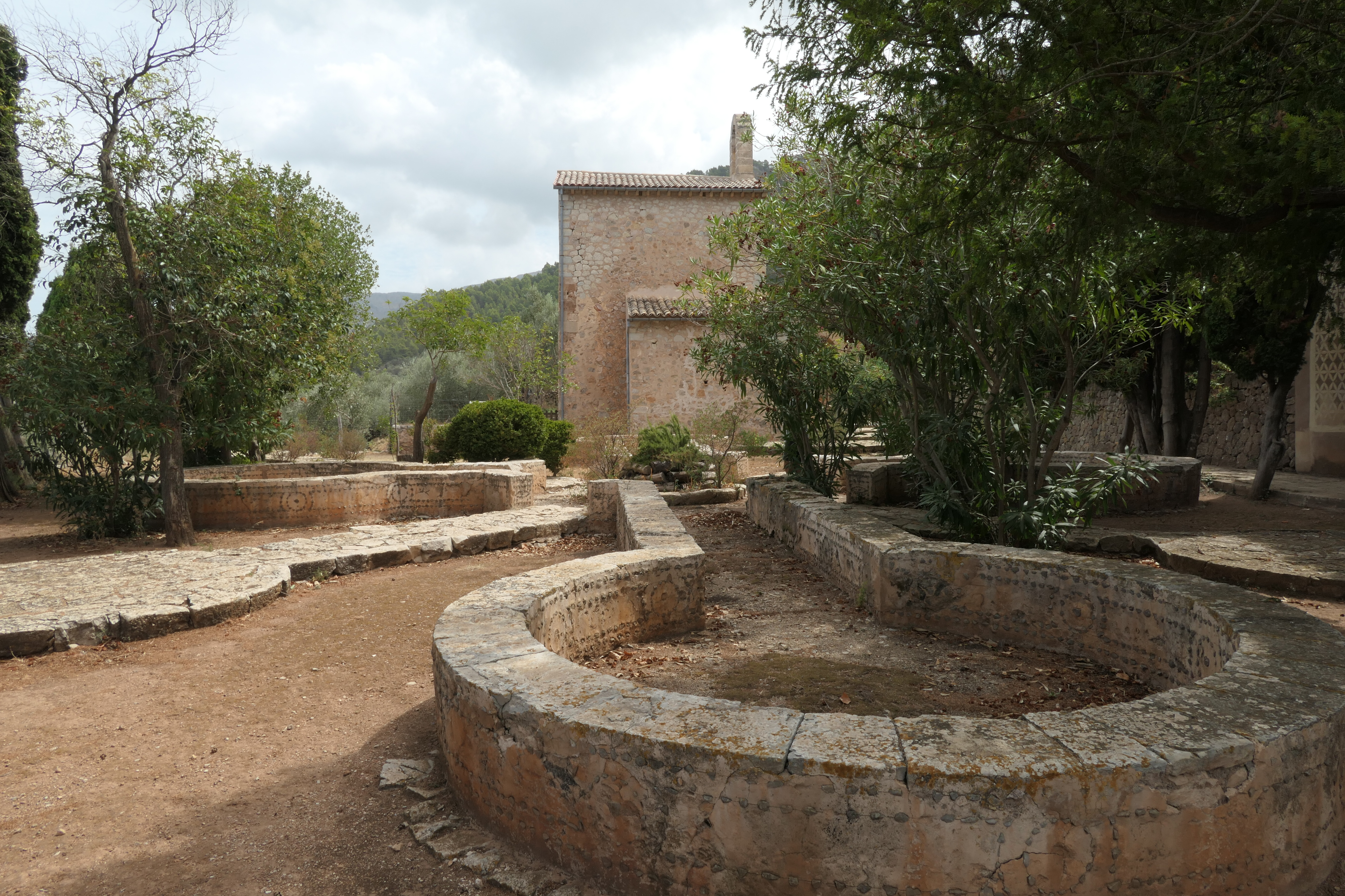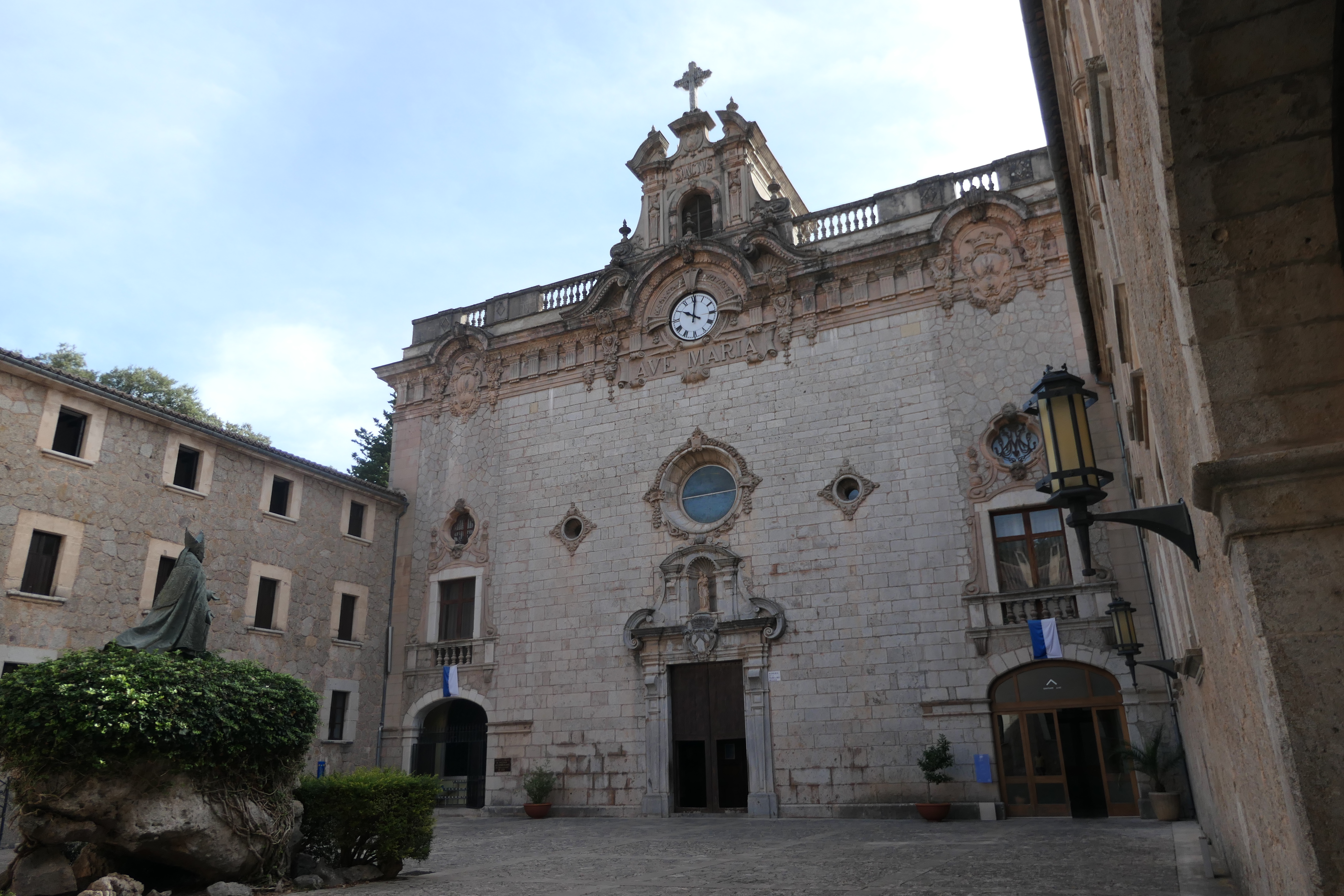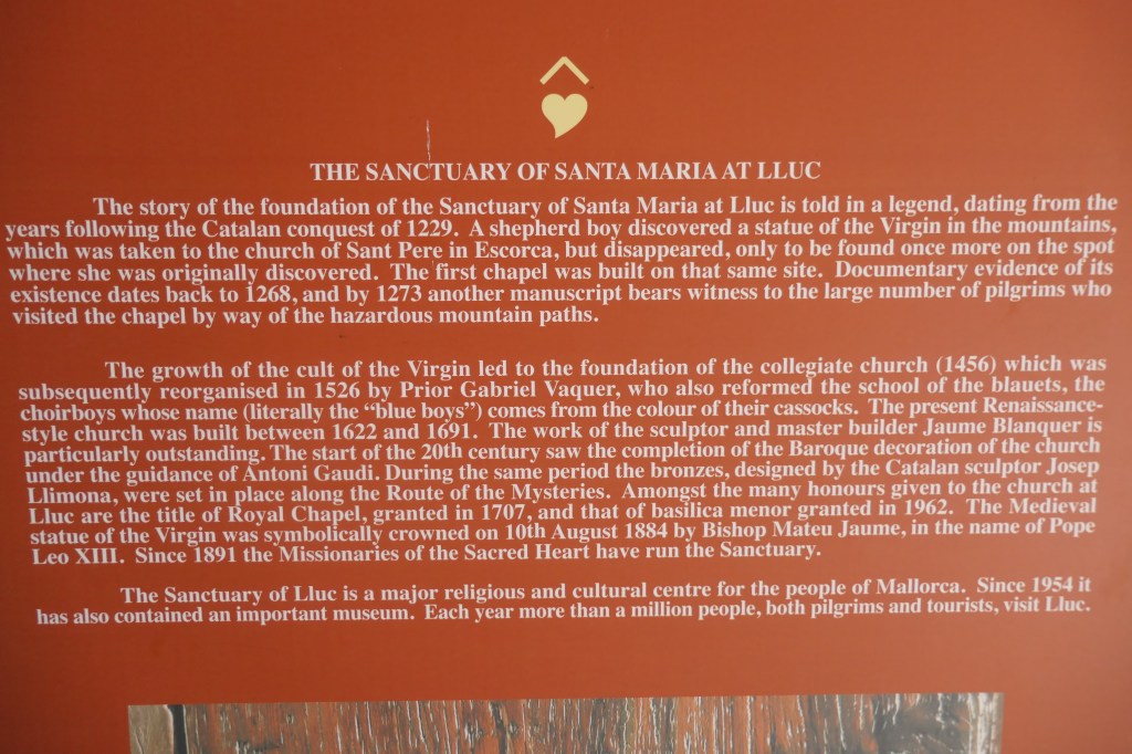 A little further from Alcudia south and west (about 30 km or 19 miles) is the 17th century Lluch Monastery, a major pilgrimage site and important religious sanctuary in Mallorca. We visited Lluch Monastery on our way back to the Palma airport as we were leaving Mallorca. It is located in the rugged Tramuntana Mountains. As the informational image notes below, the monastery receives more than a million visitors a year!