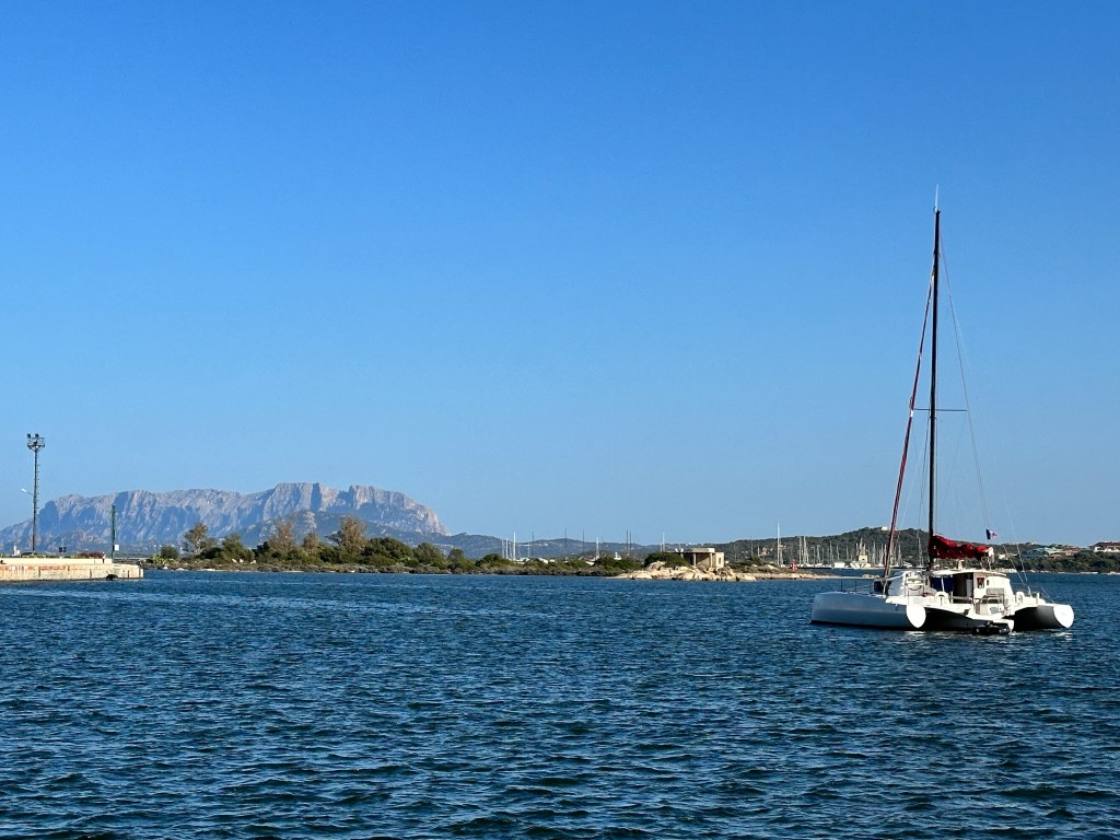 Views of Olbia and harbor, with Tavolara Island (right), the mountainous island with more beautiful beaches in the far distance.