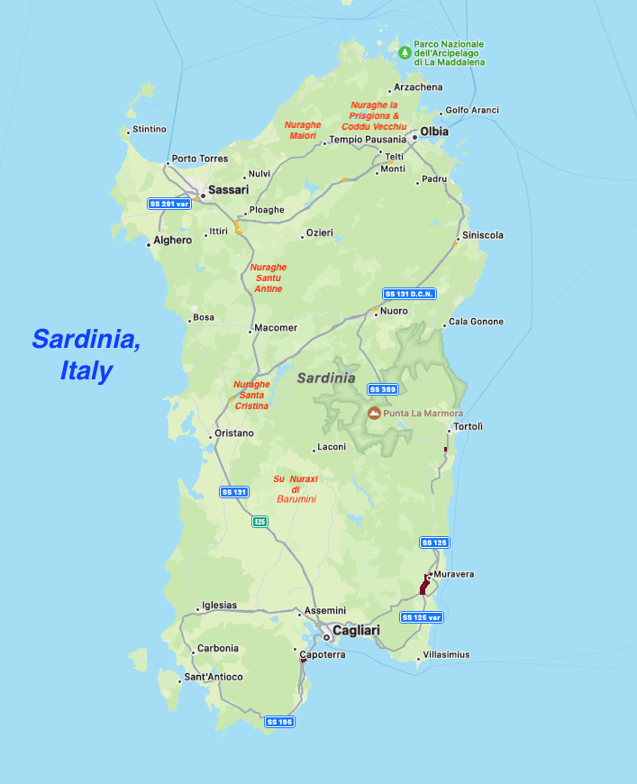 The approximate location of the Nuraghe sites we visited are shown on the map of Sardinia above.