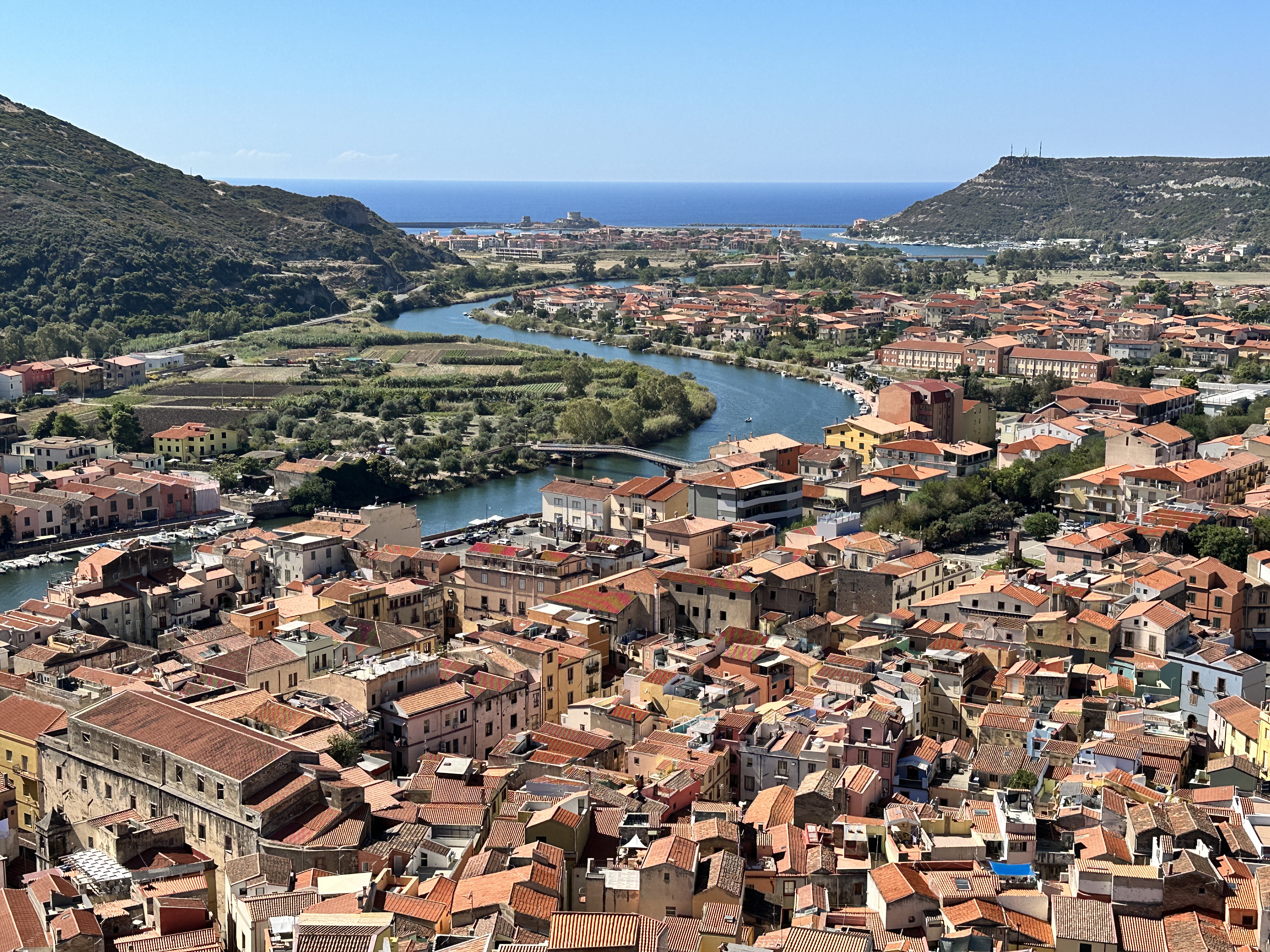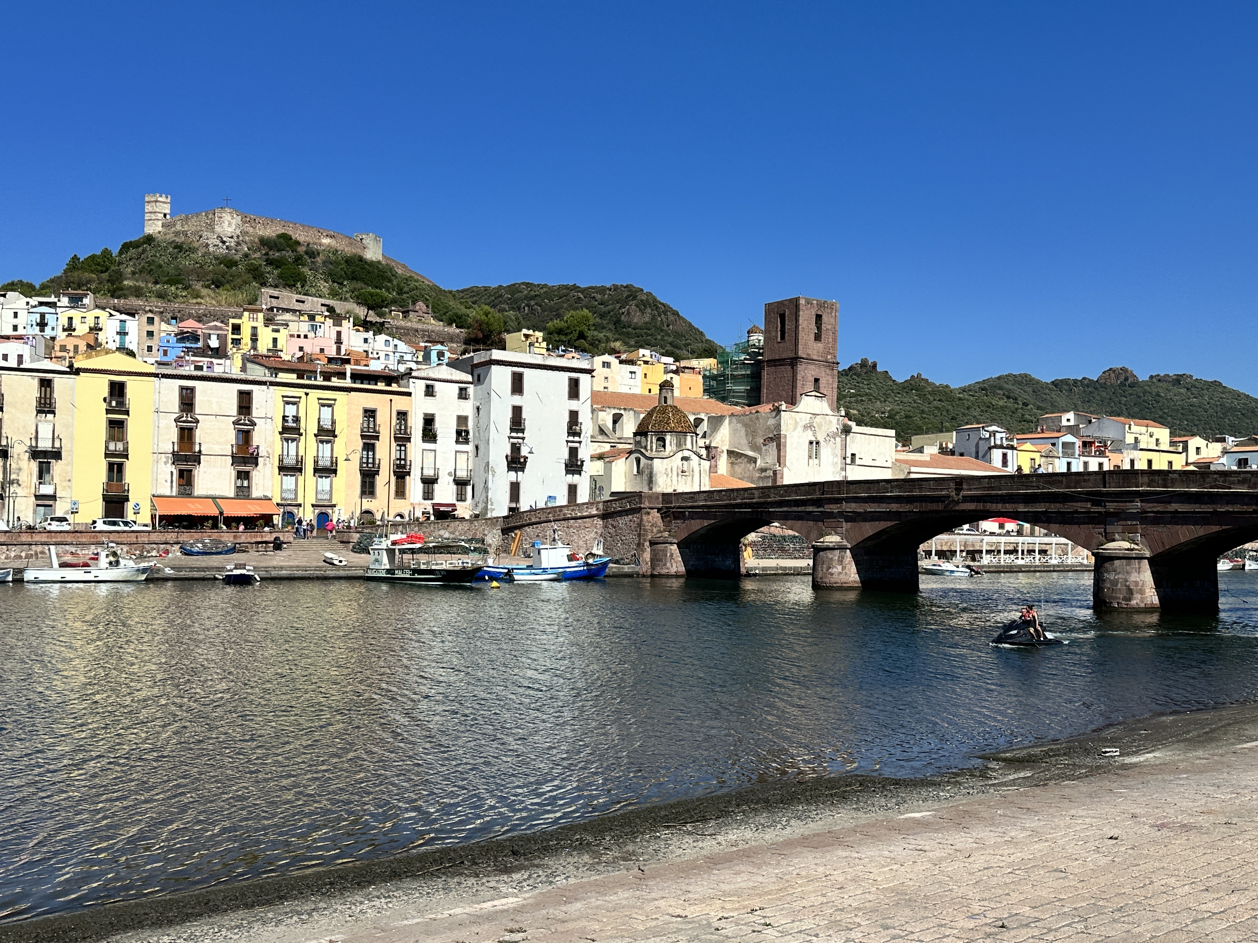A postcard view of Bosa with the Malaspina Castle in the distance, the old town across the river, and Ponte Vecchio spanning the Temo River. We parked for free near this spot, just a short walk from the old town.