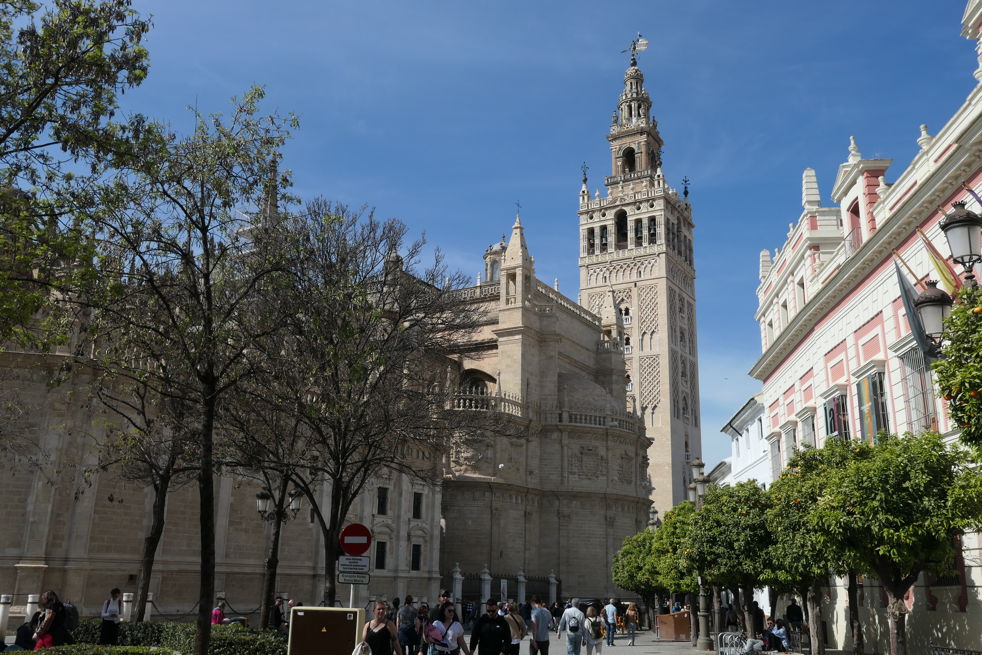 A view of the La Giralda and the northwestern entrance of the Seville Cathedral, from the shady and cool Patio de los Naranjos.