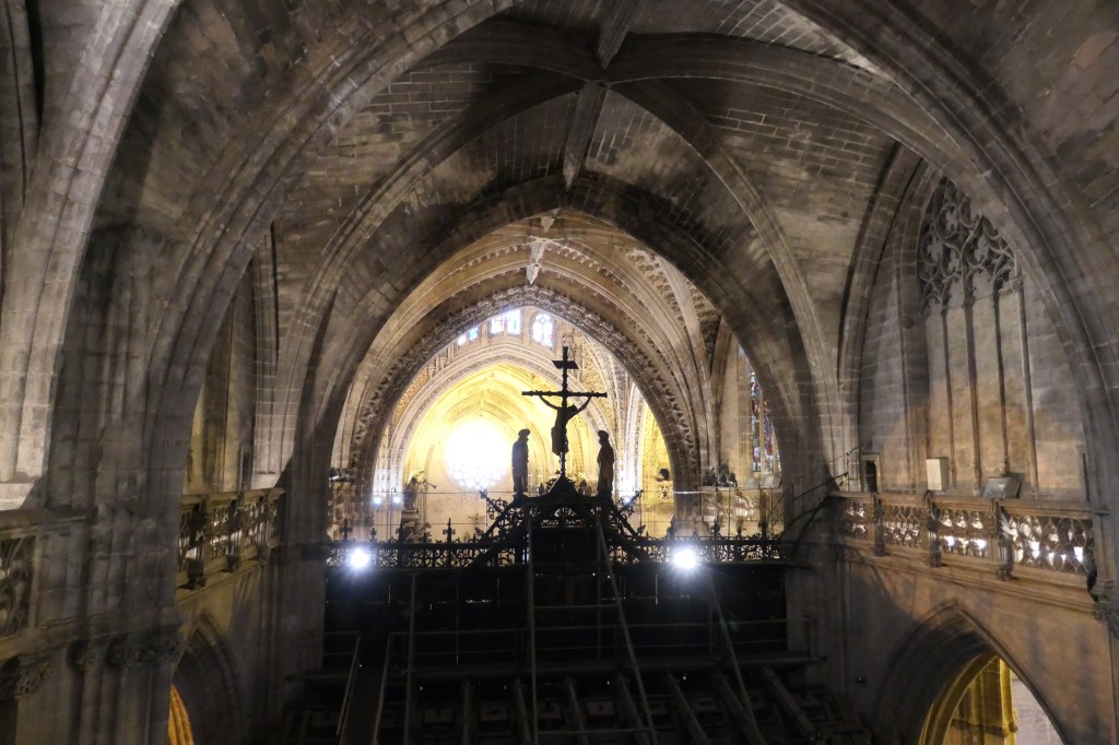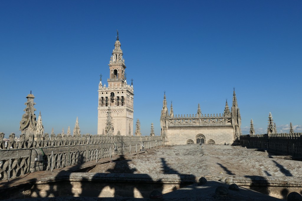 We took a tour of the Seville Cathedral rooftop (“Cubiertas”). We planned this tour in advance since tickets and tour times are limited and crowds can make for long lines. The tour was offered only in Spanish, but our tour guide was kind enough to give us a short summary in English after each stop. It was fun getting a more intimate experience with the cathedral than offered by just visiting the main hall. The rooftop tour was 20 Euro/person and the Cathedral & Tower entrance fees were 11 Euro/person as of March 2022. If I had to choose, I would just do the Cathedral & Tower, since the views are a bit better from the tower than the rooftop. The best European cathedral rooftops I have visited are Milan (Italy) and Chartres (France).
