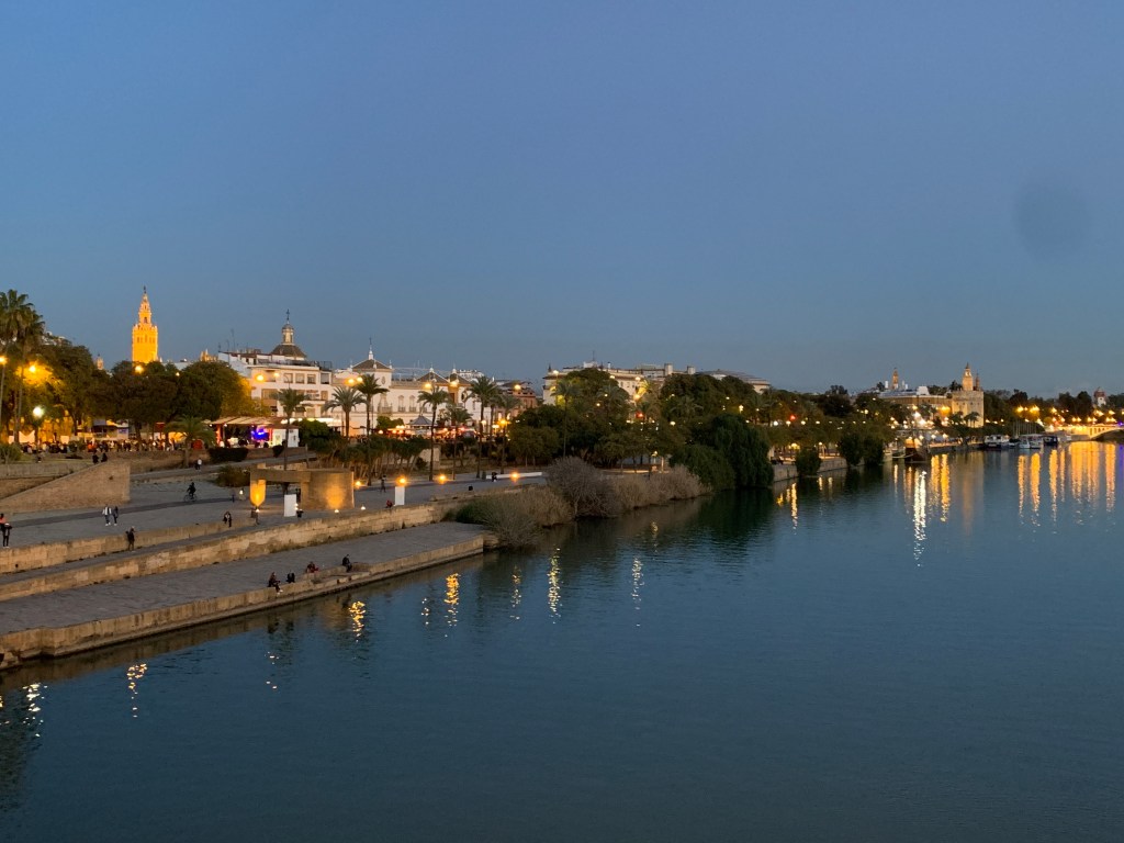 Another beautiful evening in Seville along the Guadalquivir River, with the cathedral tower (La Giralda) in the distance (on the left) and the Torre del Oro on the bank of the river (upper right).Our apartment was on the west bank of the river (to the right of this photo), just about a 10 minute walk from the river and the old quarter of Seville.