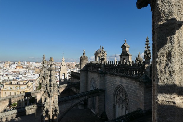 Looking down at the Real Alcázar (located inside the crenellated walls) from the Cathedral’s tower.