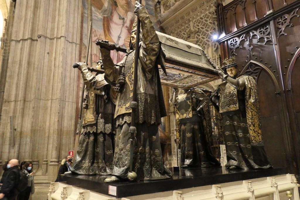 Tomb of Columbus in the Seville Cathedral – his coffin is held by representatives of the kingdoms of Castile, León, Aragón and Navarra.