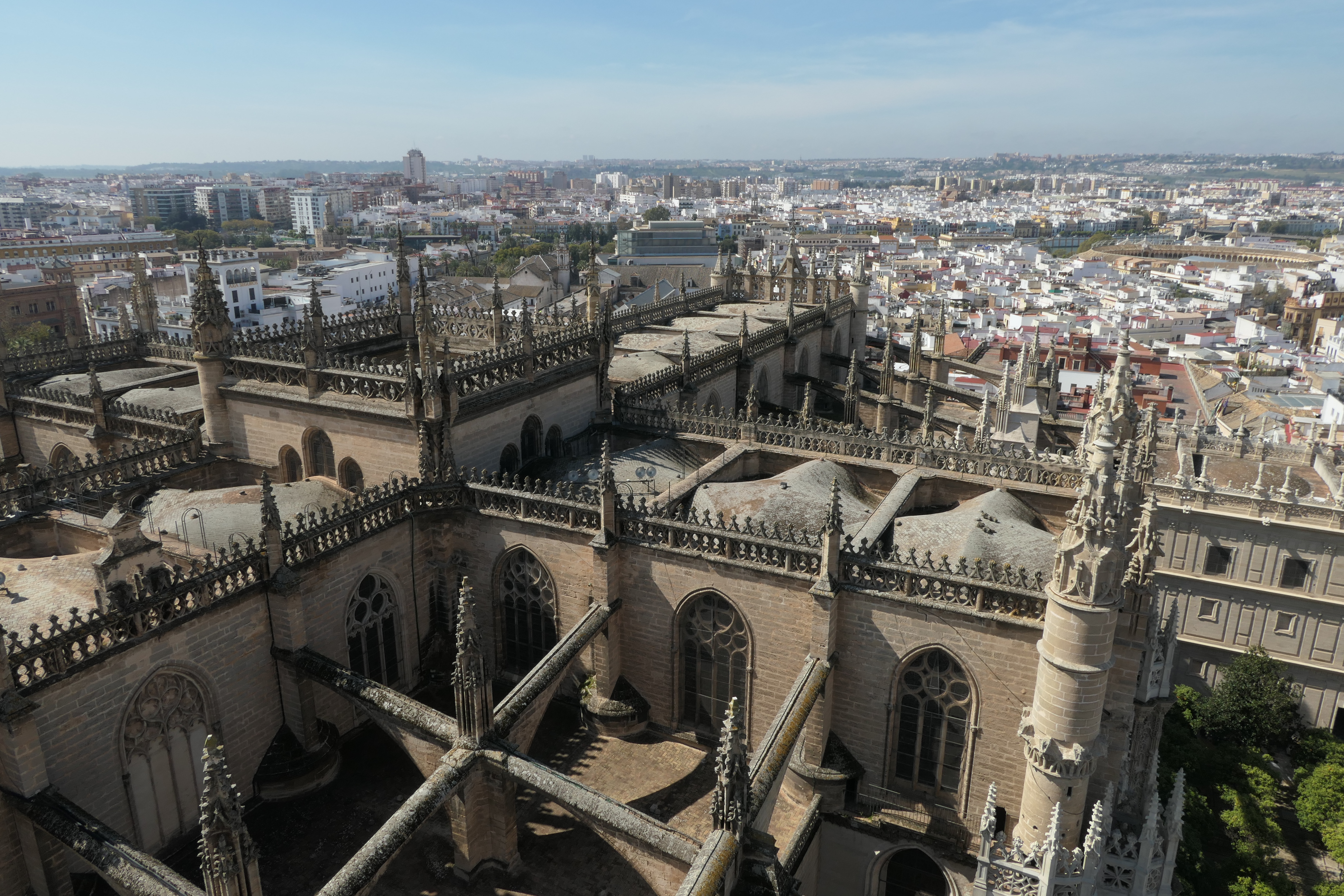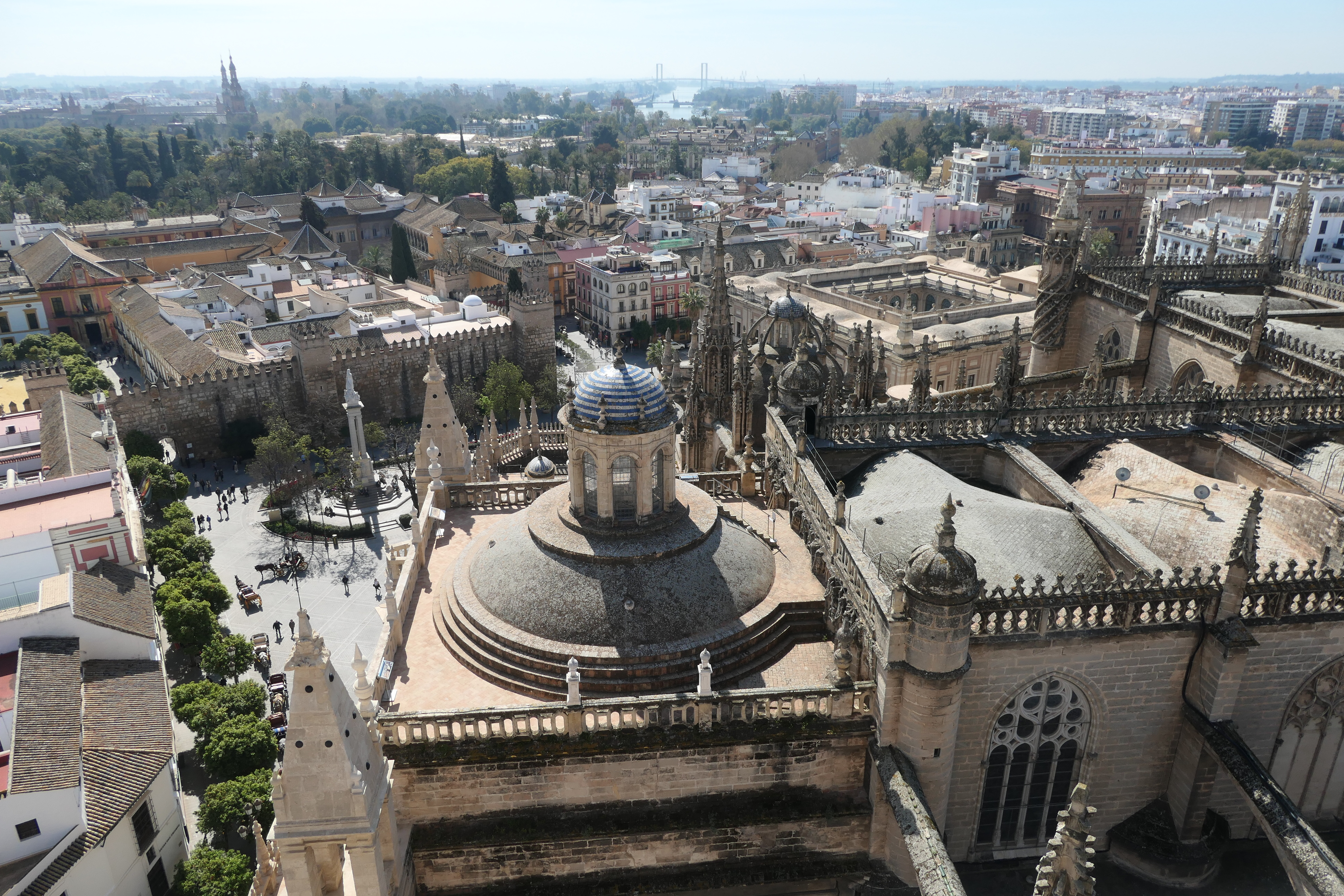 Views of the cathedral and Seville looking west from the La Giralda Tower. The Guadalquivir River is almost visible in the upper third of the photos.On the left, looking south from the tower, the Alcázar can be seen in the middle left of the photo. The photo on the right shows a view of Seville looking northeast from the tower.