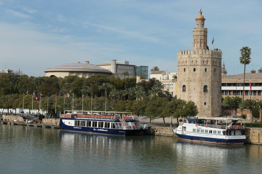 This scene of rowers in the Guadalquivir River reminded me of the Charles River in Cambridge (Boston) where you can see serious rowers almost any time of year.