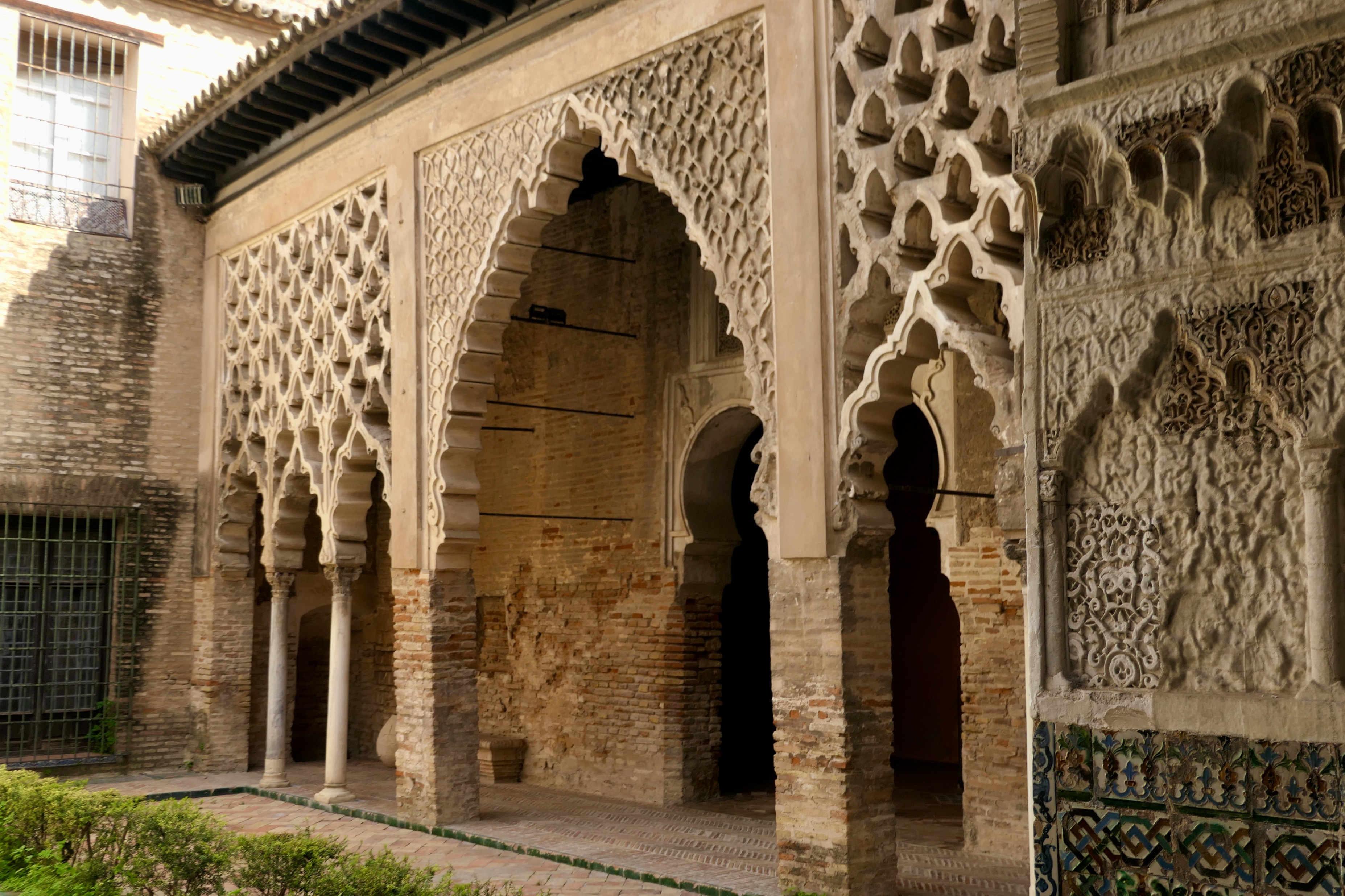 Patio del YesoDetail of plasterwork.Patio del Yeso (left), one of the oldest parts of the Alcázar(12th century). On the right, more detail of the plaster craftmanship found at the Alcázar.