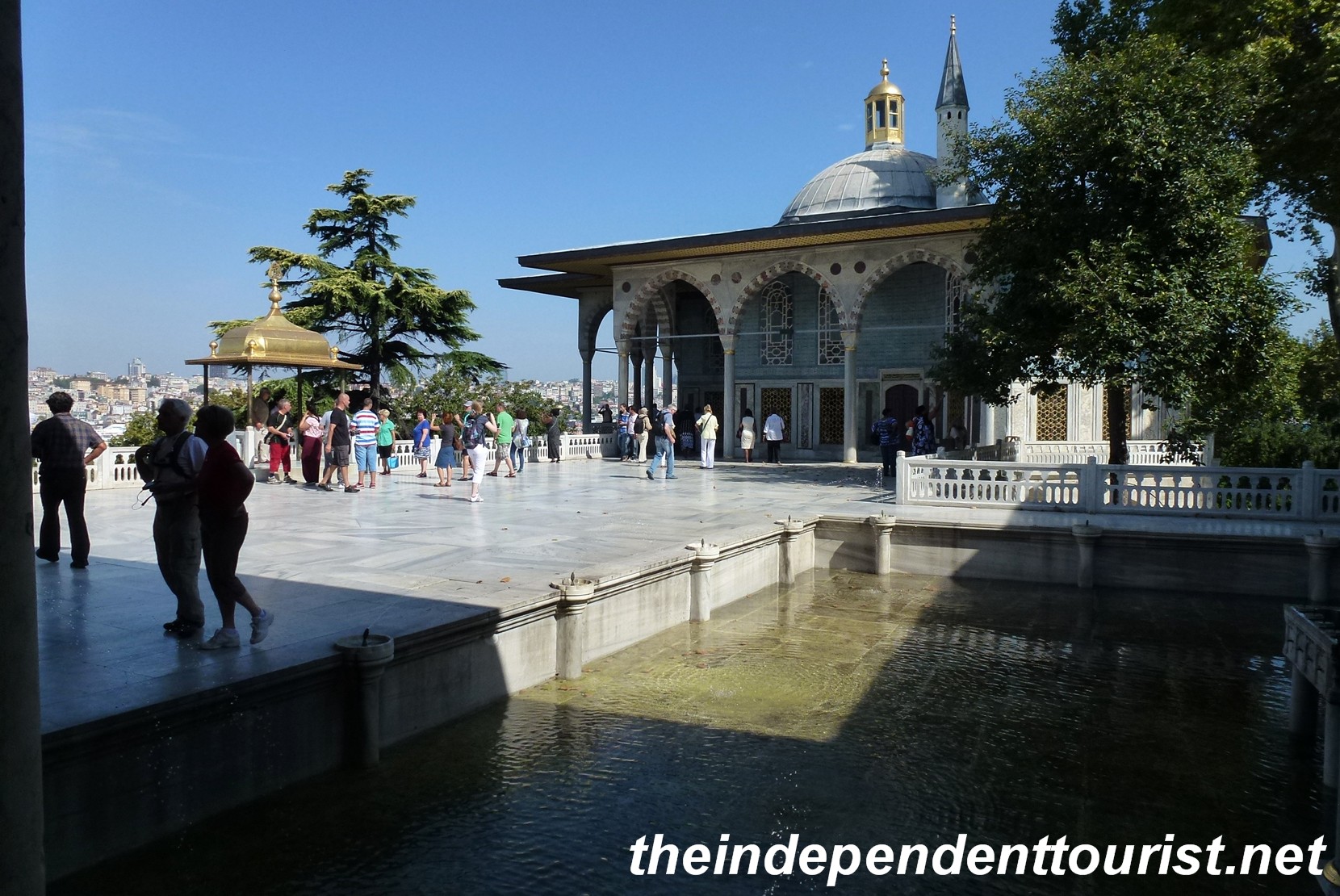 A view of the Fourth Courtyard. The Baghdad Pavilion (center-right) was built in 1639 to commemorate the capture of Baghdad by the Sultan Murat IV. The small golden dome to the left is where the sultan would break his fast after the month of Ramadan.