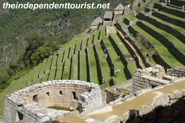 The Temple of the Sun in the foreground–the windows are aligned perfectly with the summer and winter solstices. This building was Hiram Bingham’s first discovery at Machu Picchu. In the distance are the terraced agricultural fields.